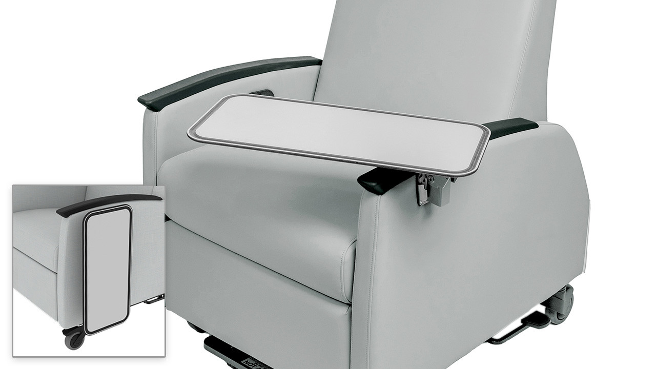 - Optional Adjustable Side Tray swivels at base and can be positioned vertically at side of arm when not in use (extends 4” from arm). Measures 23” L x 10.7”W. Attached to recliner arm via included Quick Release Bracket, standard on right side (facing). Access to handle may be impeded when specified on same side as handle.
