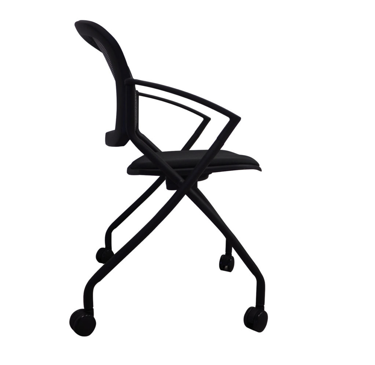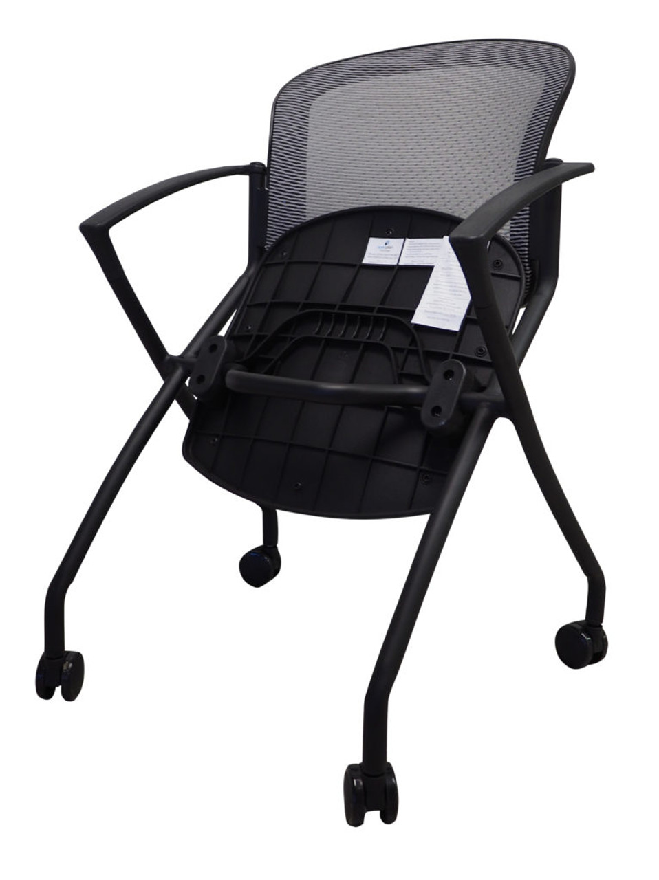 This affordable nesting chair arrives mostly assembled and will support users up to 250 pounds. This nesting office chair is boxed in sets of 4. A tremendous value in a chair that folds up and 'nests' for storage when not in use. We like the Steal nesting chair since when it shows up, the frame is all assembled (welded) and the back is mounted. All you have to do is bolt on the seat and snap in the casters. Very rugged chair. Perfect for training rooms and breakout areas. This is our most popular nesting chair given its quality, warranty and price point. Priced is per carton of 4 Steal nesting chairs. Ships Free to a commercial address ONLY.