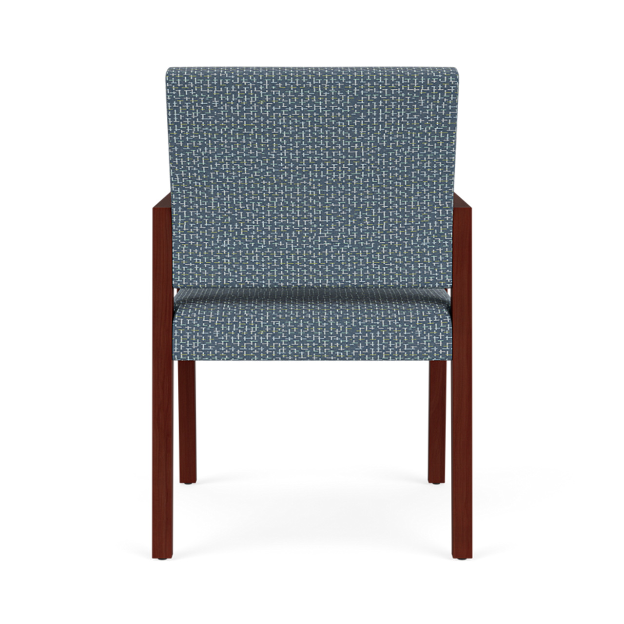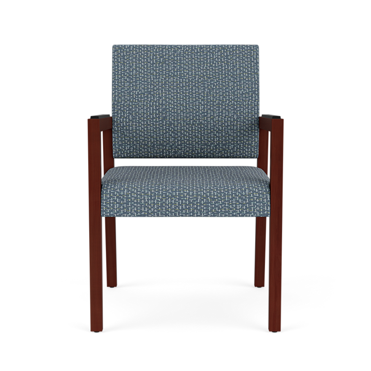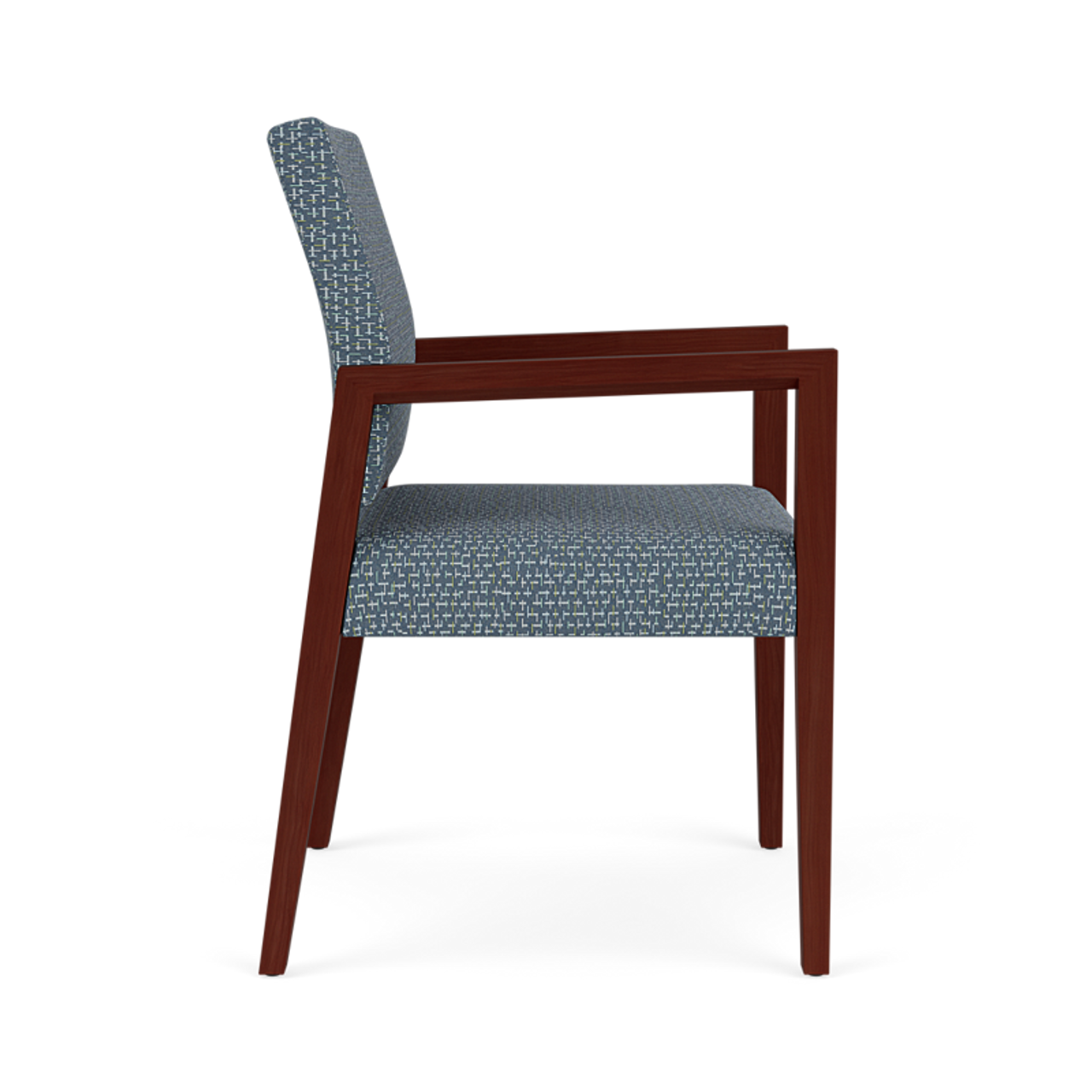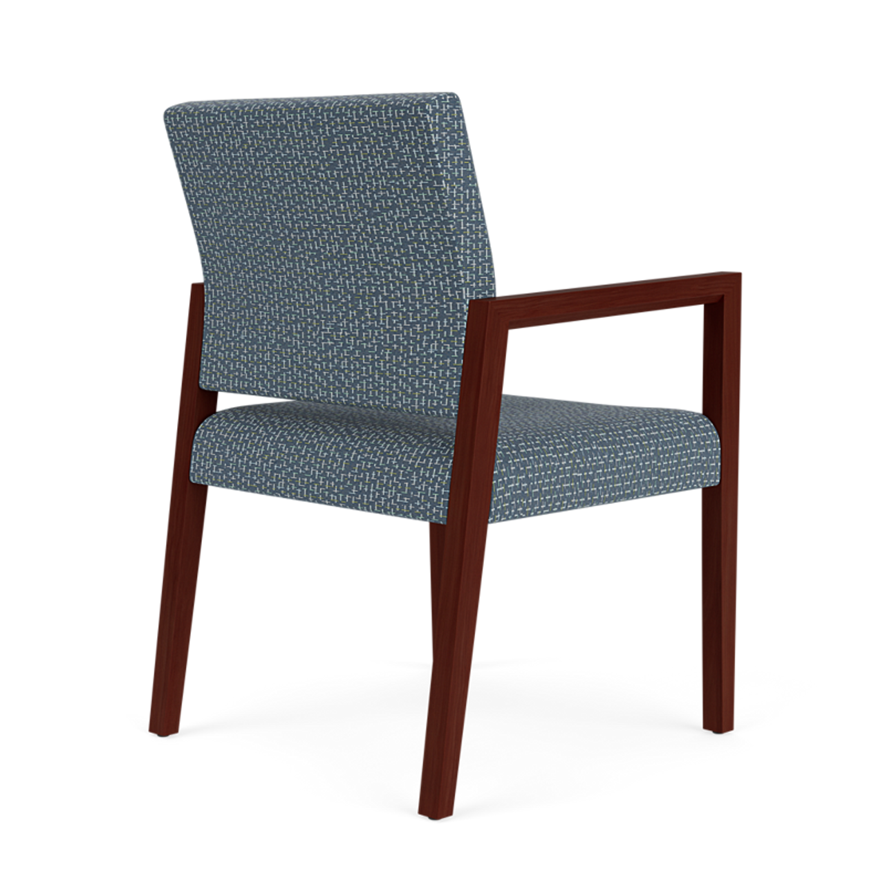 The Brooklyn Wood Guest Chair by Lesro has distinctive contemporary styling with a chamfered edge detail. This visitor chair is perfect for reception area and lounge seating applications. Available in 9 wood finishes (See below) This visitor chair is also offered in over 200 different fabrics and vinyl. The wood guest chair is manufactured with Lesro's Matrex Support System, ensuring long-life comfort. A set of two black urethane arm pads can be added to the arm version visitor chair to provide additional padding. Minimal Assembly Required.