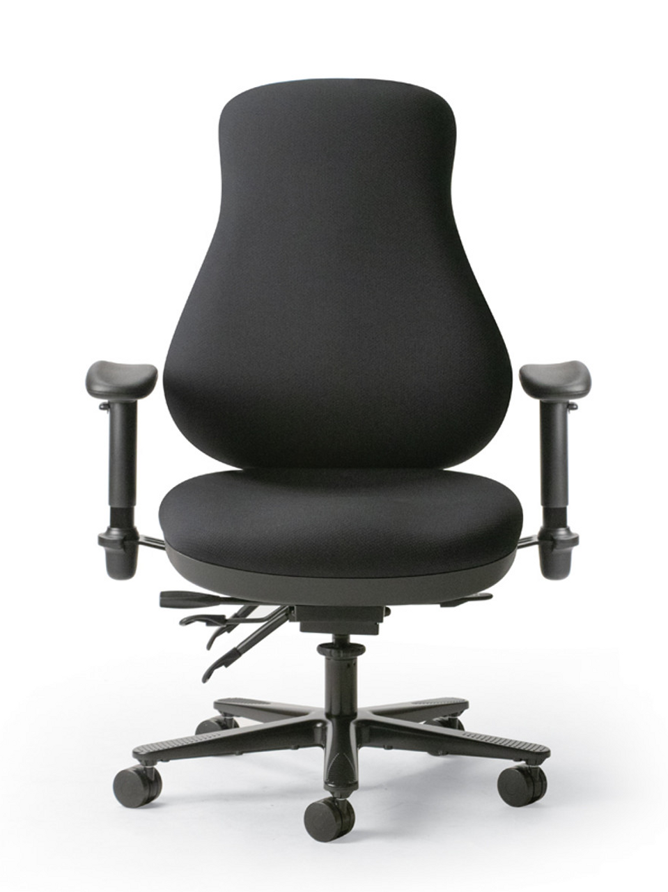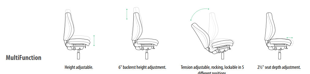 Multi-function Center tilt rocking mode. Backrest angle adjustable 16° (89° to 105°). Seat angle adjusts 7° (-5° to 2°). Tension adjustable. Lockable in 6 different positions. Backrest height adjusts 6 inches into 27 different positions using an intuitive, visible lever. Seat depth adjusts 2½” in 6 positions. Seat height adjusts pneumatically.