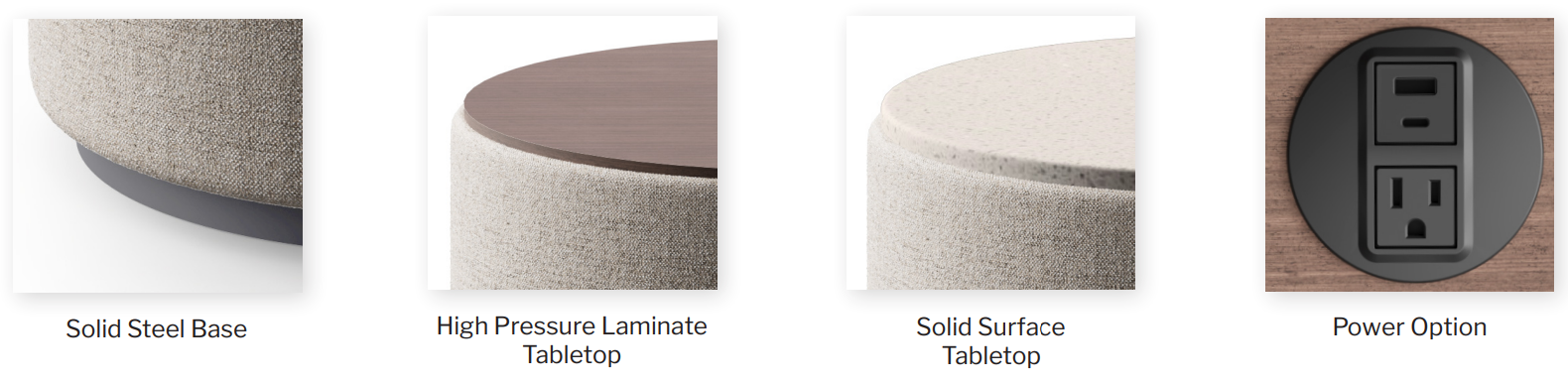 - Tables have fully upholstered sides with laminate or solid surface tops