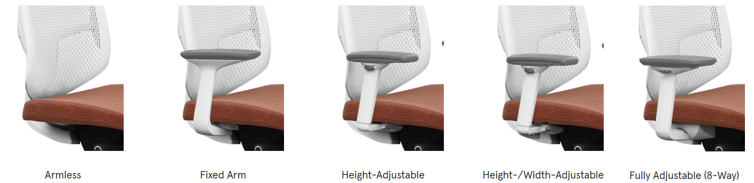 - Armless, height-adjustable, height-/width-adjustable or fully adjustable arms