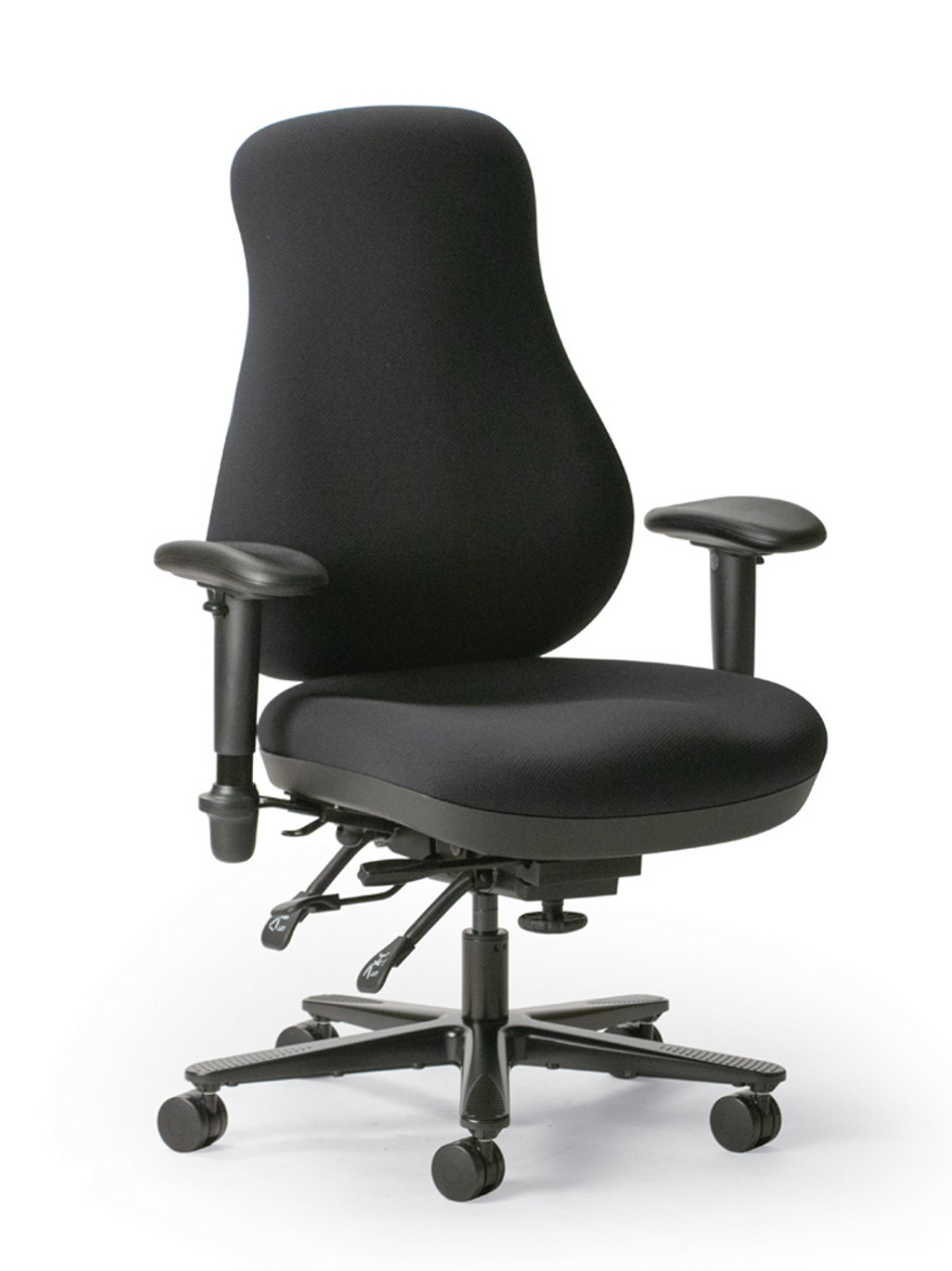 Multi-function Center tilt rocking mode. Backrest angle adjustable 16° (89° to 105°). Seat angle adjusts 7° (-5° to 2°). Tension adjustable. Lockable in 6 different positions. Backrest height adjusts 6 inches into 27 different positions using an intuitive, visible lever. Seat depth adjusts 2½” in 6 positions. Seat height adjusts pneumatically.