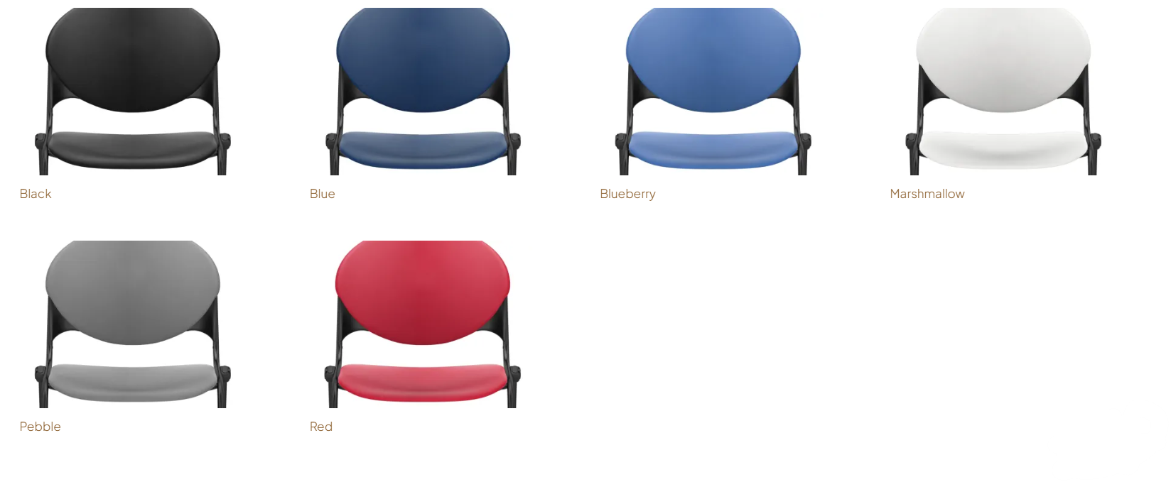 These colorful stacking chairs are available in the following plastic colors: Blue, Pebble, Marshmallow, Black, Blueberry, and Red